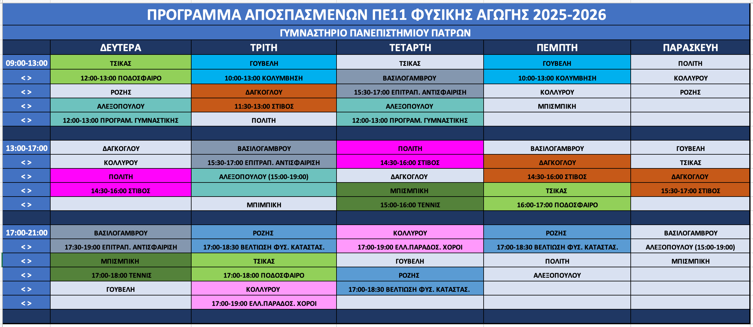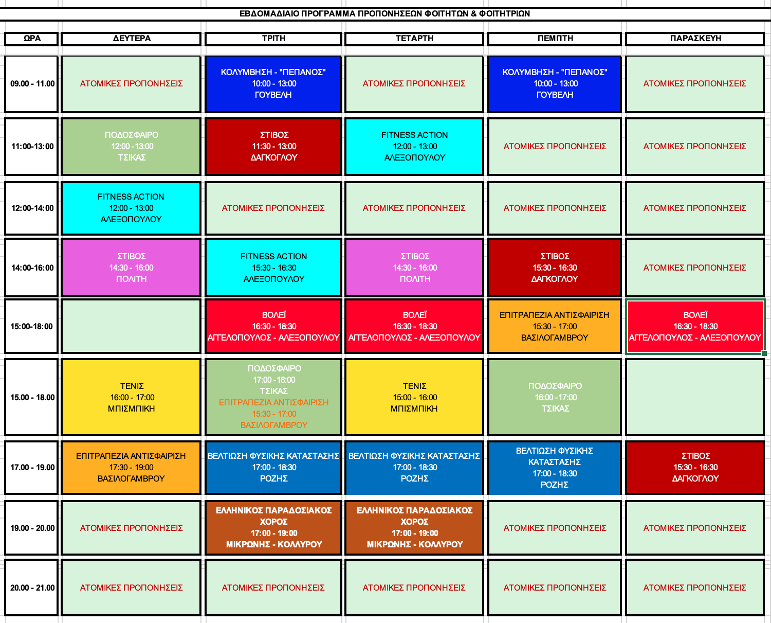 Τα προγράμματα εβδομαδιαίων προπονήσεων περιγράφονται αναλυτικά στον παρακάτω πίνακα: